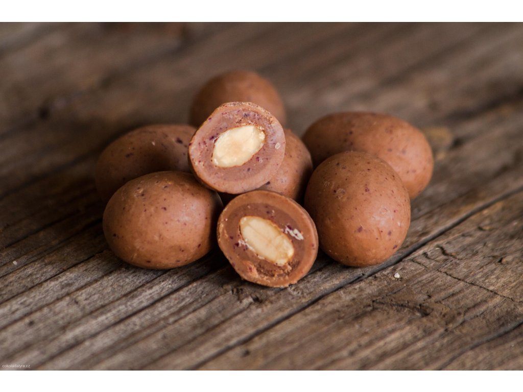 Sicilské mandle čerstvě pražené v naší pražírně, obalené čerstvým mandlovým nugátem a potažené mléčnou karamelovou čokoládou s dotekem višně. Křupavá delikatesa, která rozhodně stojí za to!