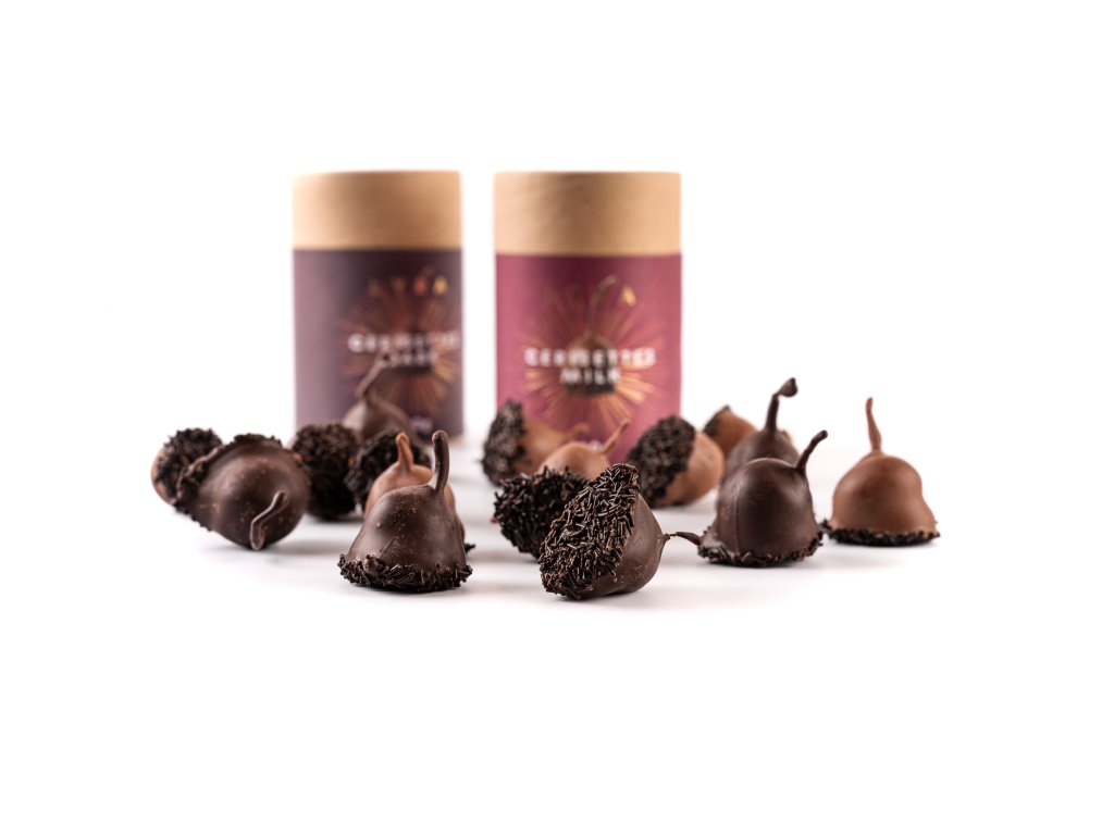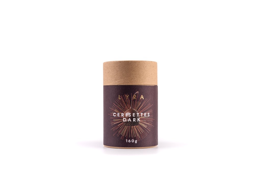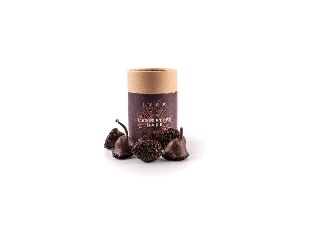 Celé třešně (se stopkou a peckou) ponořené v alkoholickém likéru a zalité hořkou čokoládou. Lahůdka i dárek v krásném designovém balení.