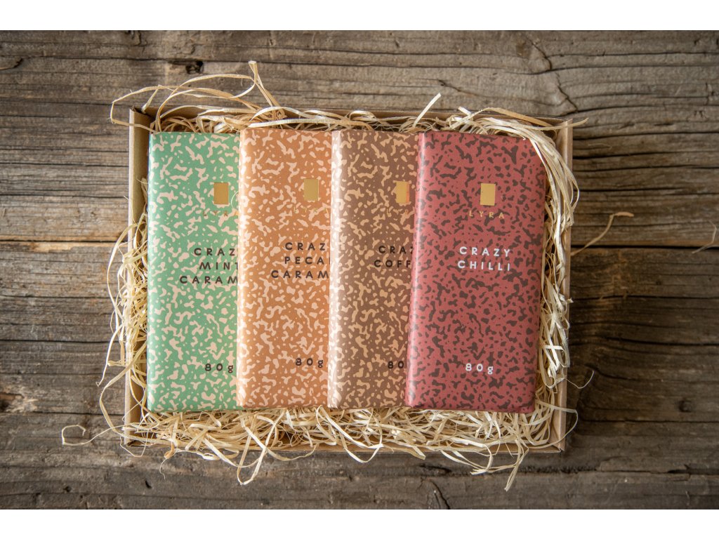 V dárkové kolekci CRAZY se setkáte s kombinací pekanů a karamelu, s pálivou energií chilli, s jemnou vůní kávy i s mátovým karamelem, který čokoládě dodává osvěžující lehkost. Dárkové balení CRAZY je jako ochutnávka čokoládového světa, kde se každý kousek promění v malý experiment plný překvapení.