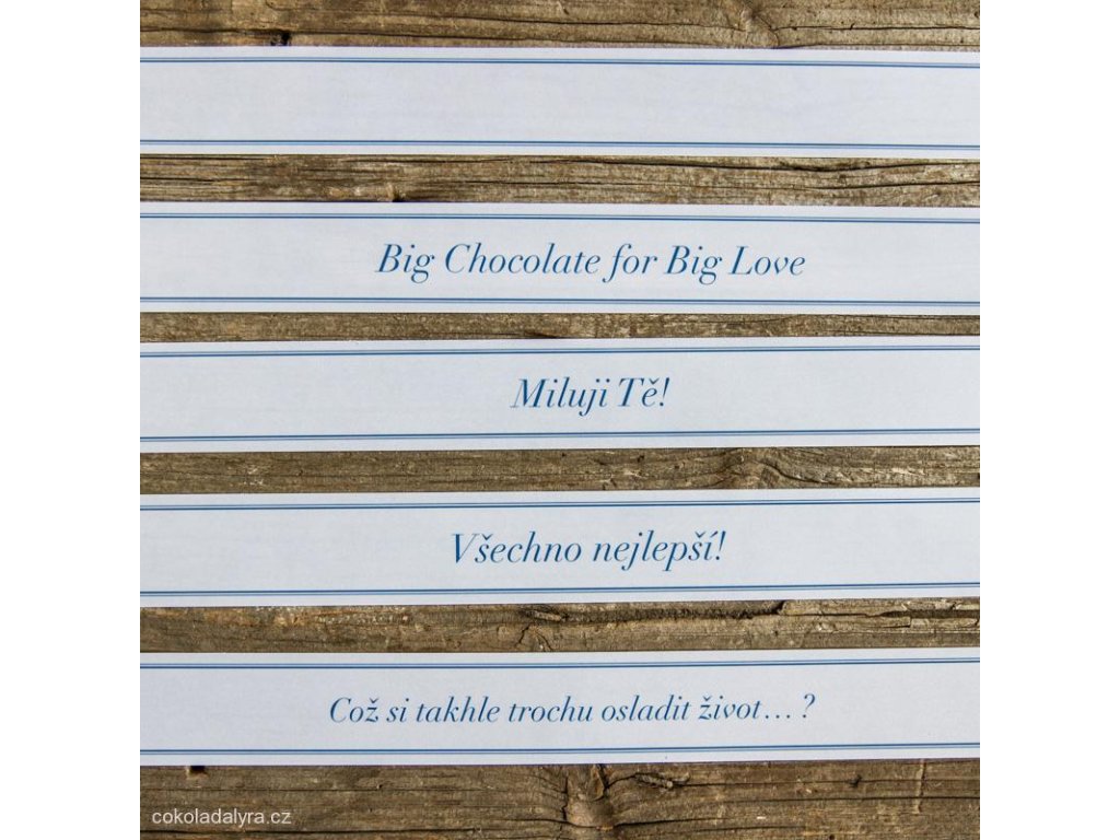 Jako doplněk můžete zvolit proužek pauzovacího papíru s potiskem či bez potisku, který čokoládě přidá konkrétní podobu případného přání.